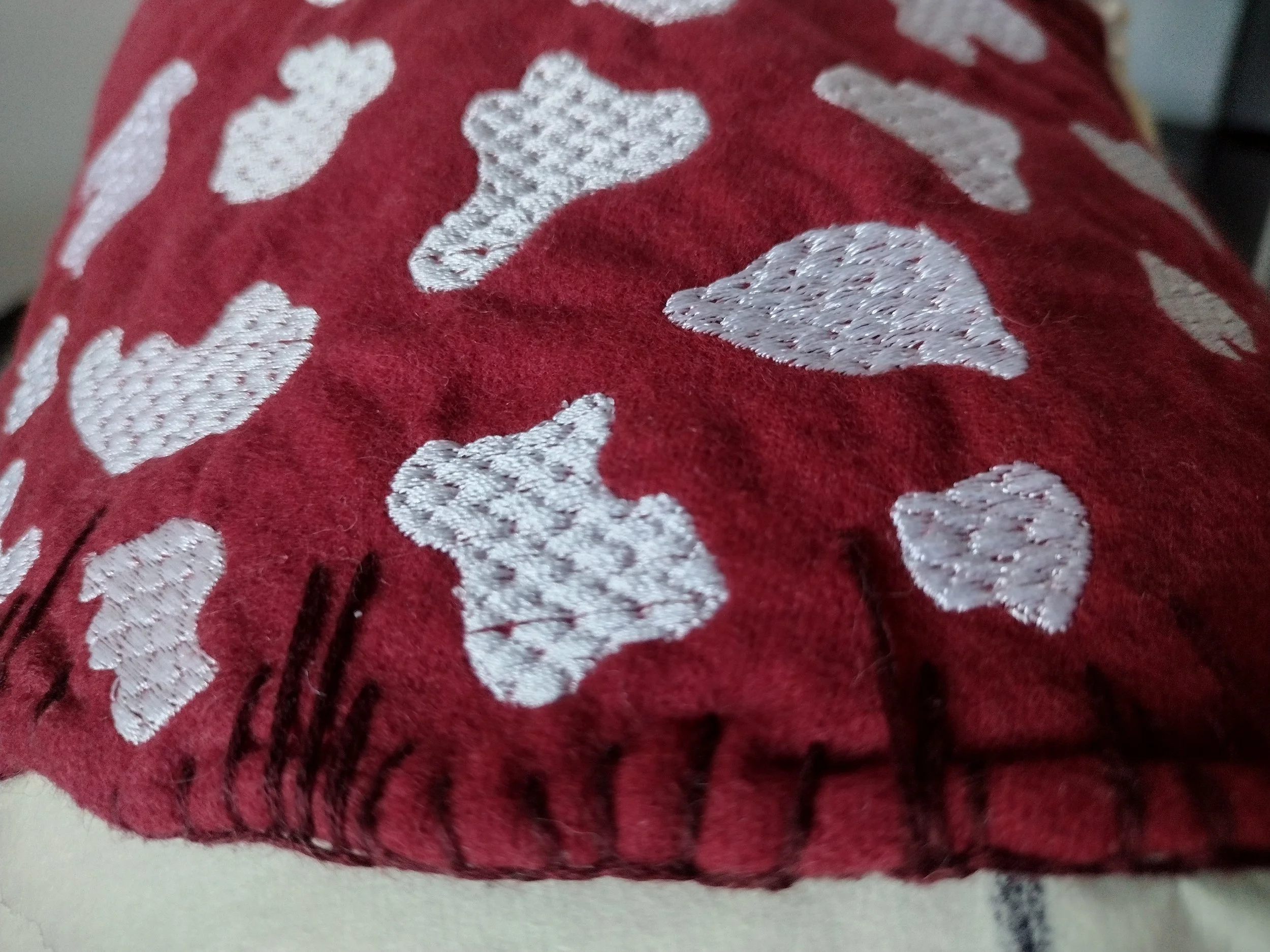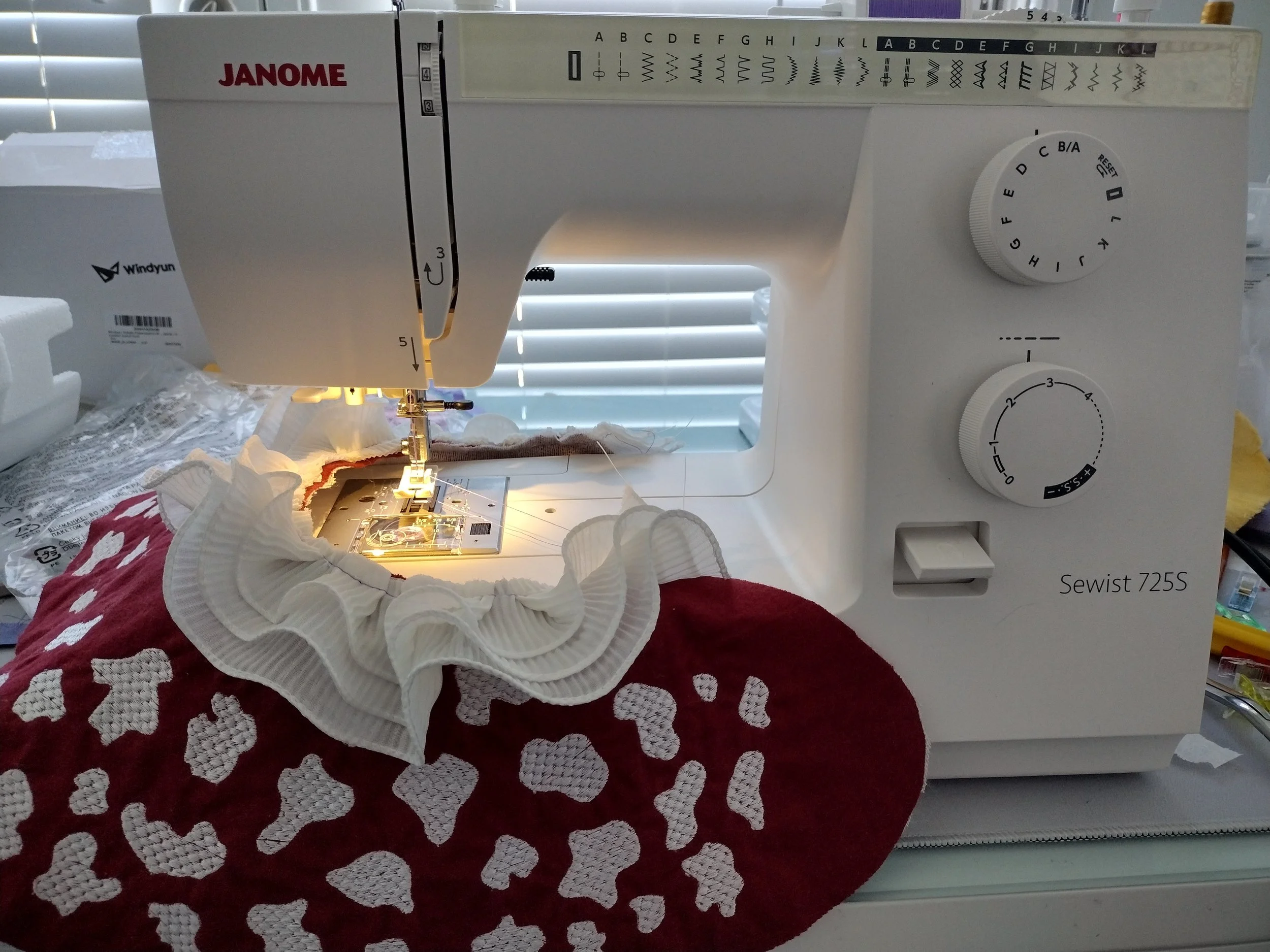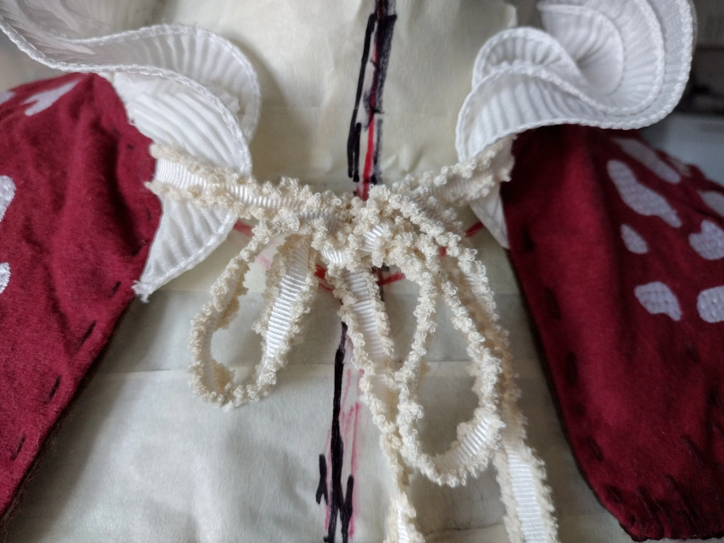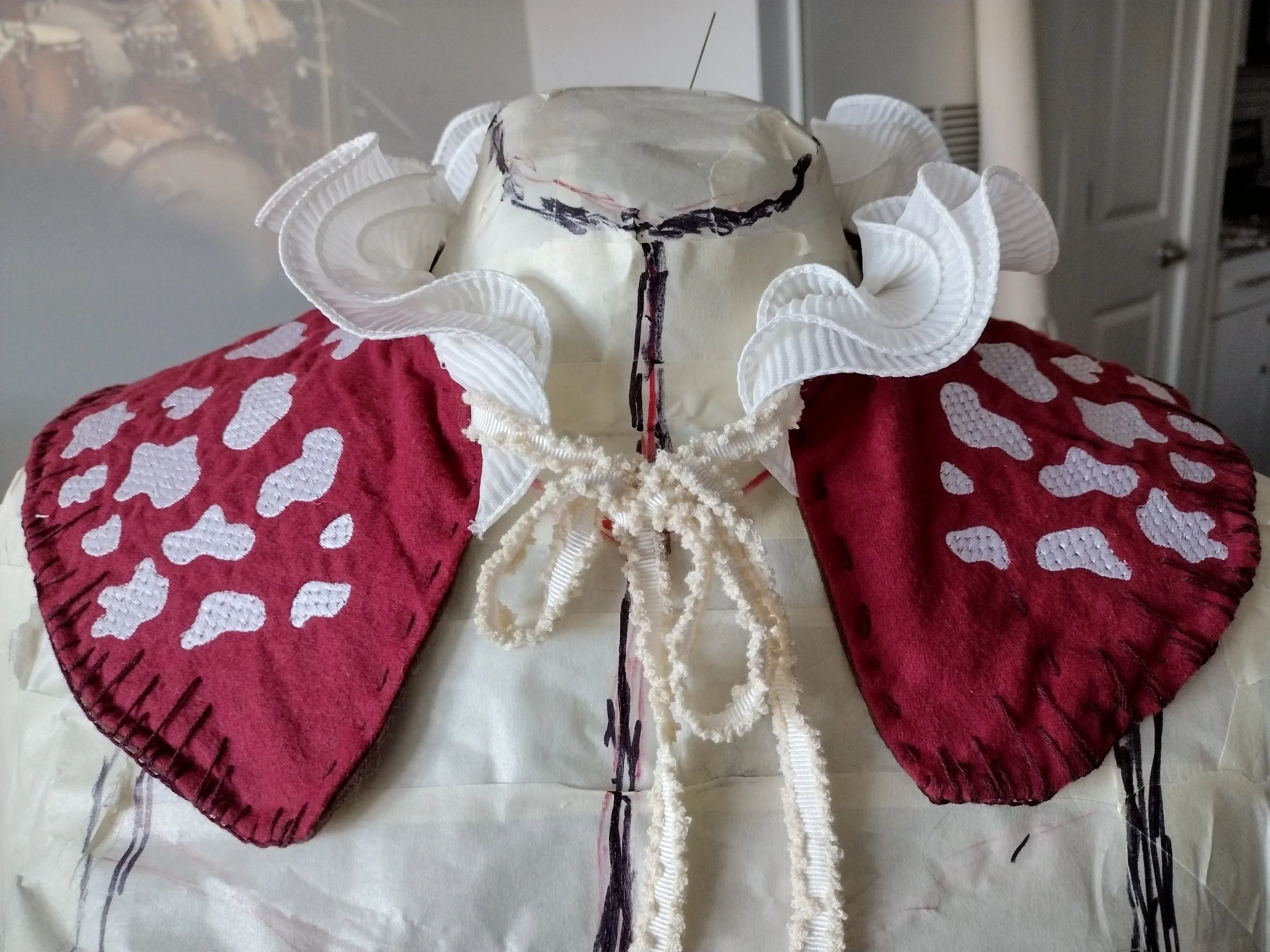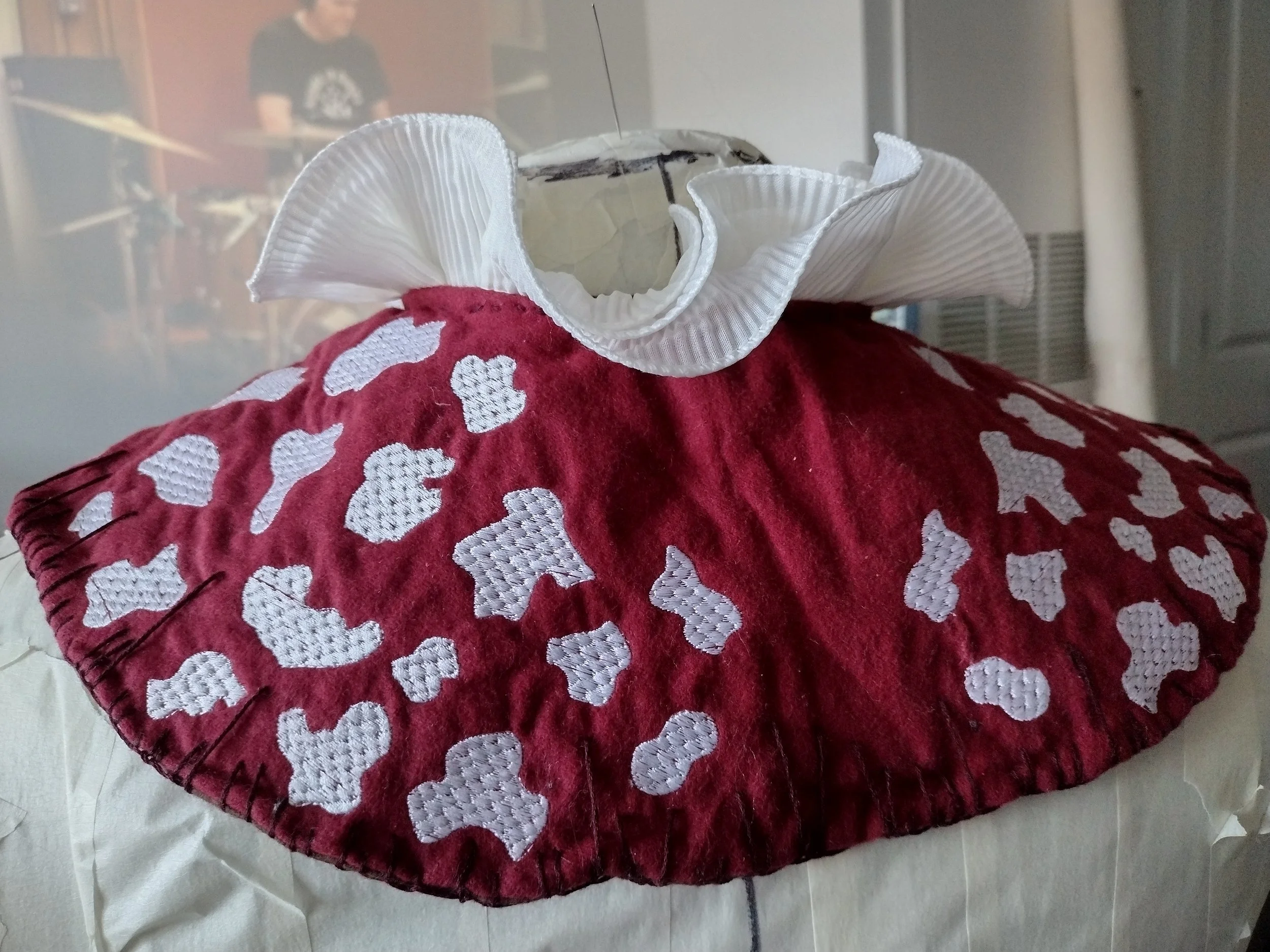 Machine embroidery, hand blanket stitched details. Frilly ruffle and tie up-fly agaric inspired.